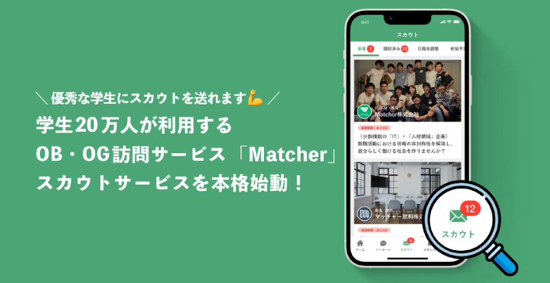 Matcher Scoutは、「自社の求めている学生に、手間を掛けずに、リスク無く採用したい」そんなニーズにお応えする、新卒向けダイレクトリクルーティングサービスです。